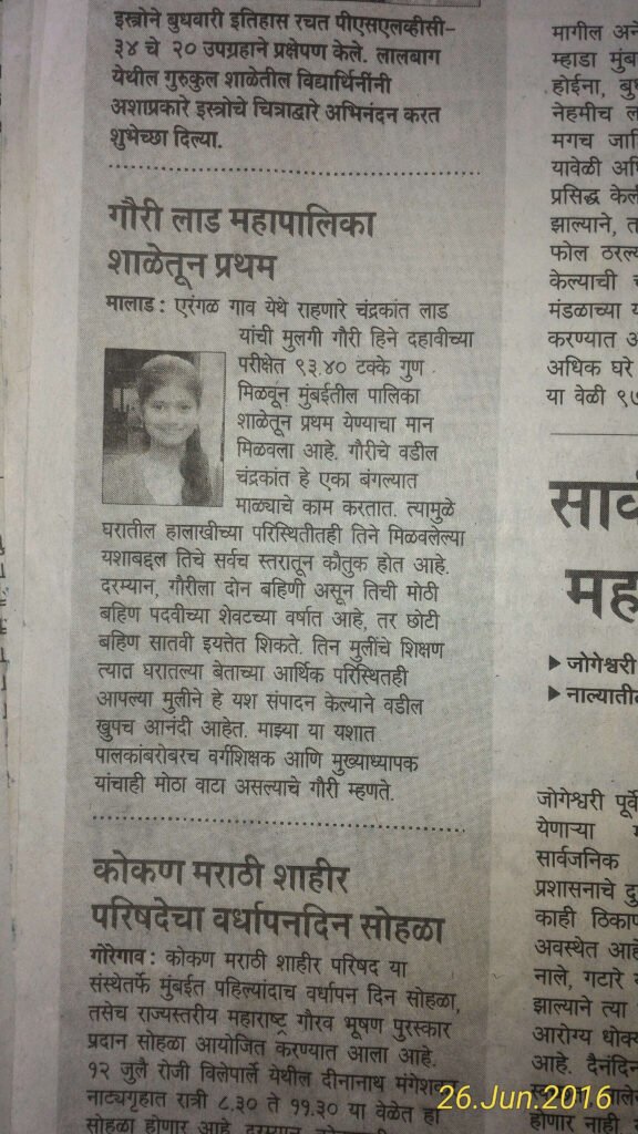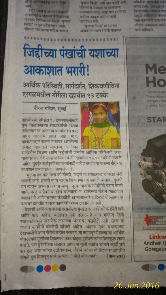 In June 2016, Hidush supported its first meritorious student who passed the SSC examination from a BMC school with more than 90 percent marks. The student’s academic achievement was documented in a newspaper article dated 26 June 2016.
